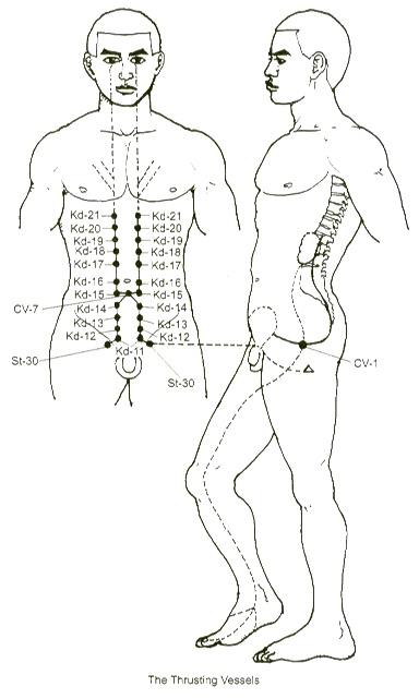 The master point of the Chong is Spleen 4, which is combined with Pericardium 6 on the yin wei maichannel. This pair affects the heart, chest and stomach. This "vital passage" regulates the flow ofqi and blood in the 12 regular meridians, and is significant in gynecological disorders, digestive issues, prolapses, and problems with the heart. Energetically, it relates to intergenerational patterns, issues arising from abuse, and cellular memory. Psychospiritually, an imbalance in theChong meridian negatively impacts our self-acceptance and self-love.
