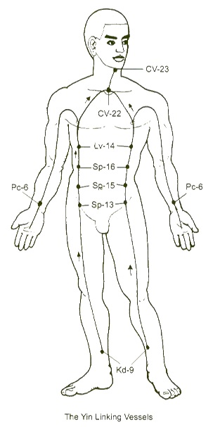 The pairing of ren mai and yin qiao mai, with its attendant Lung/Kidney relationship, energetically affects the lungs, chest and throat, and is very useful in a clinical situation, especially in addressing breathing imbalances.