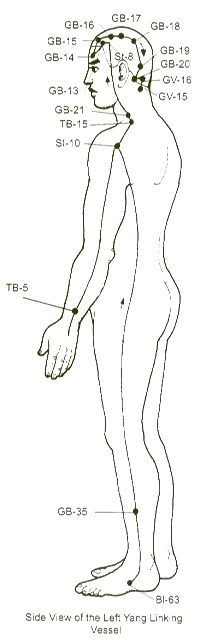 The yang qiao mai is paired with the Du Mai; syndromes include a sensation of "walking on a slant," excessive thinking, and a generalized feeling of being overwhelmed and out-of-control. Conditions such as insomnia, epilepsy, facial paralysis and Bell's palsy (related to wind in the face) are relevant.